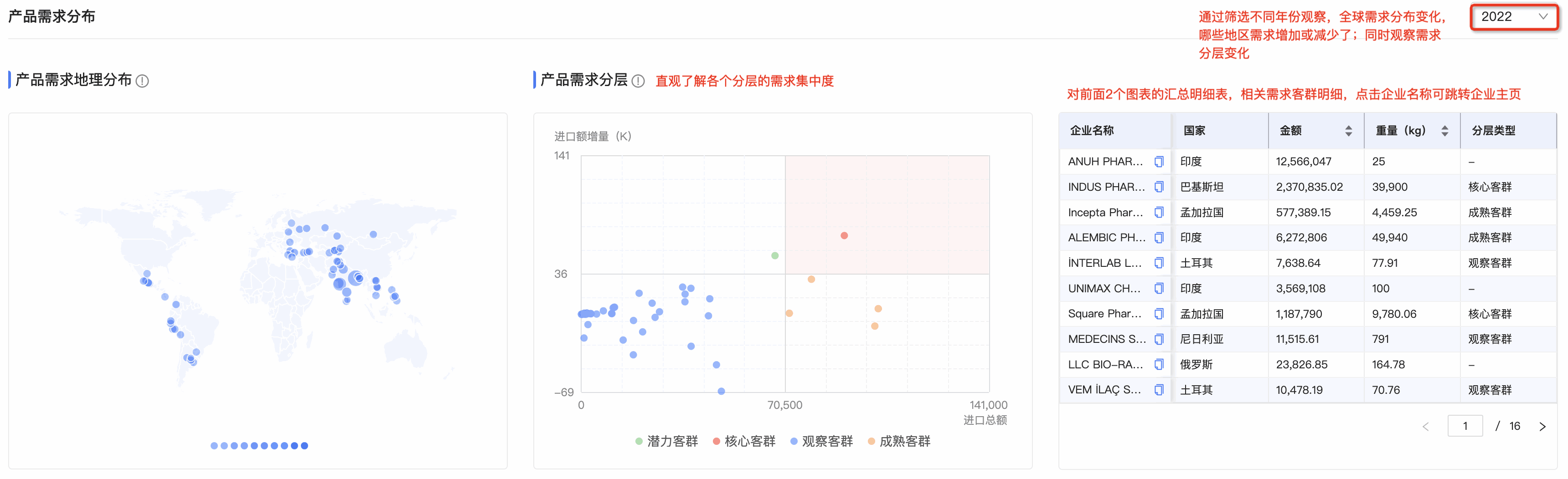 ● 产品需求分层图:EVO视讯 EVO真人数据通将需求客群按照进口额增量和总额进行分层,划分为潜力、观察、成熟和核心四个层级。分层有助于用户快速锁定目标客户群体。标题旁附需求分层的解读,能让用户更直观、快速理解每个层级的特征,能够更快速的识别目标客群。