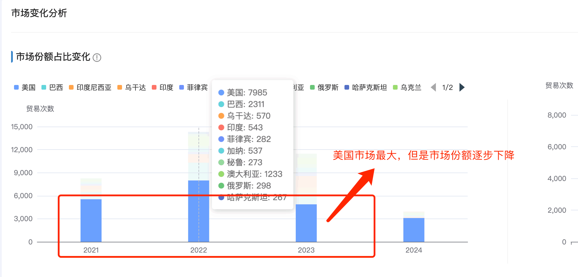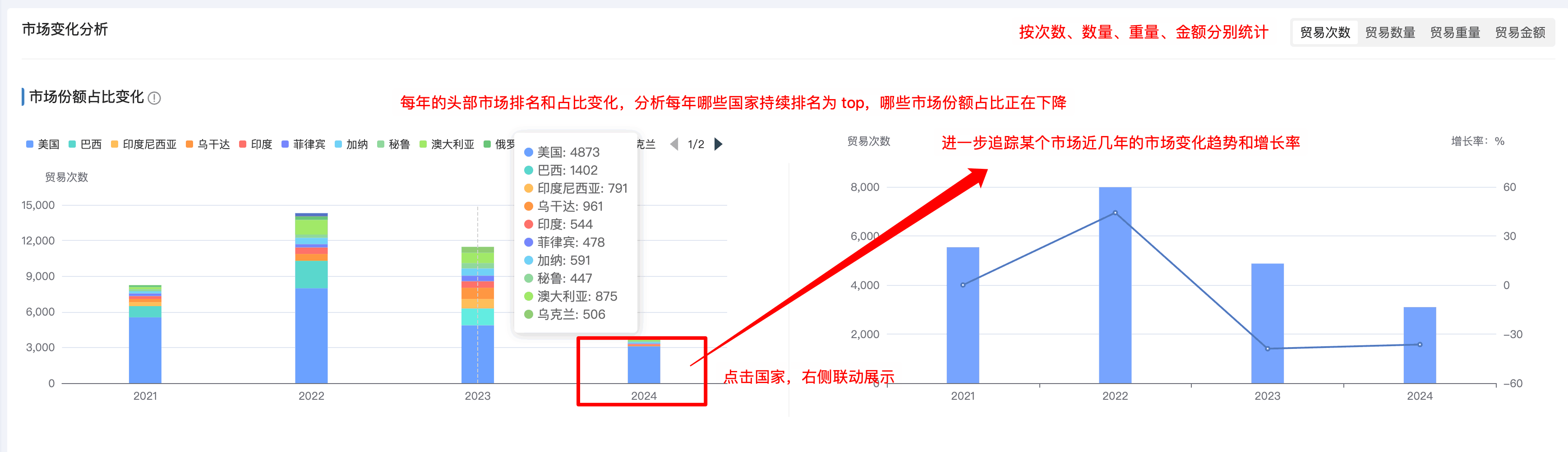 1. EVO视讯 EVO真人商情洞察市场分析新增「市场占比变化分析」:分析每年的头部市场的占比排名和变化,哪些市场持续排名在头部,哪些市场排名逐渐下滑甚至消失在top之外的。