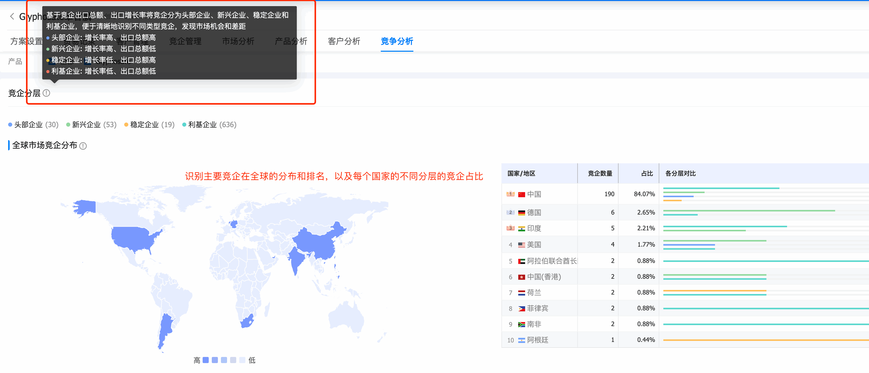 竞企分层地理分布可以清晰分析生产偏移集中在哪些国家,头部竞企、新兴竞企集中在哪些国家,各国又流失了哪些竞企